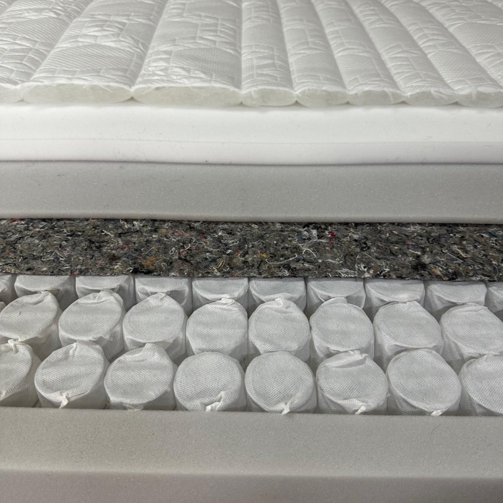 Partea superioară a saltelei include un strat de Spumă cu memorie de 6cm cu densitate de 50 kg/mc. Acest material se adaptează la forma corpului, redistribuind presiunea și oferind un confort excepțional. Spuma cu memorie revine la forma inițială după utilizare, menținând susținerea optimă pe termen lung.