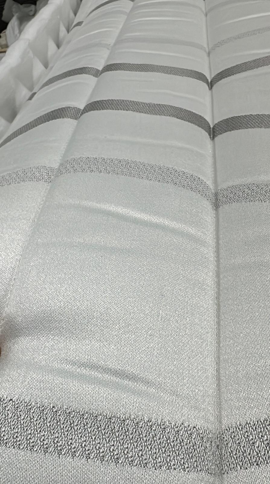 Husa cu greutatea de 530 gr/mp este confecționată din bumbac de 350 gr de calitate superioară, matlasat cu vată volumică hipoalergenică de 180 gr/mp și material nețesut de 20 g/mp. Banda laterală din țesătură gri este realizată din 100% fibră hipoalergenică, asigurând confort și siguranță pe timpul somnului.